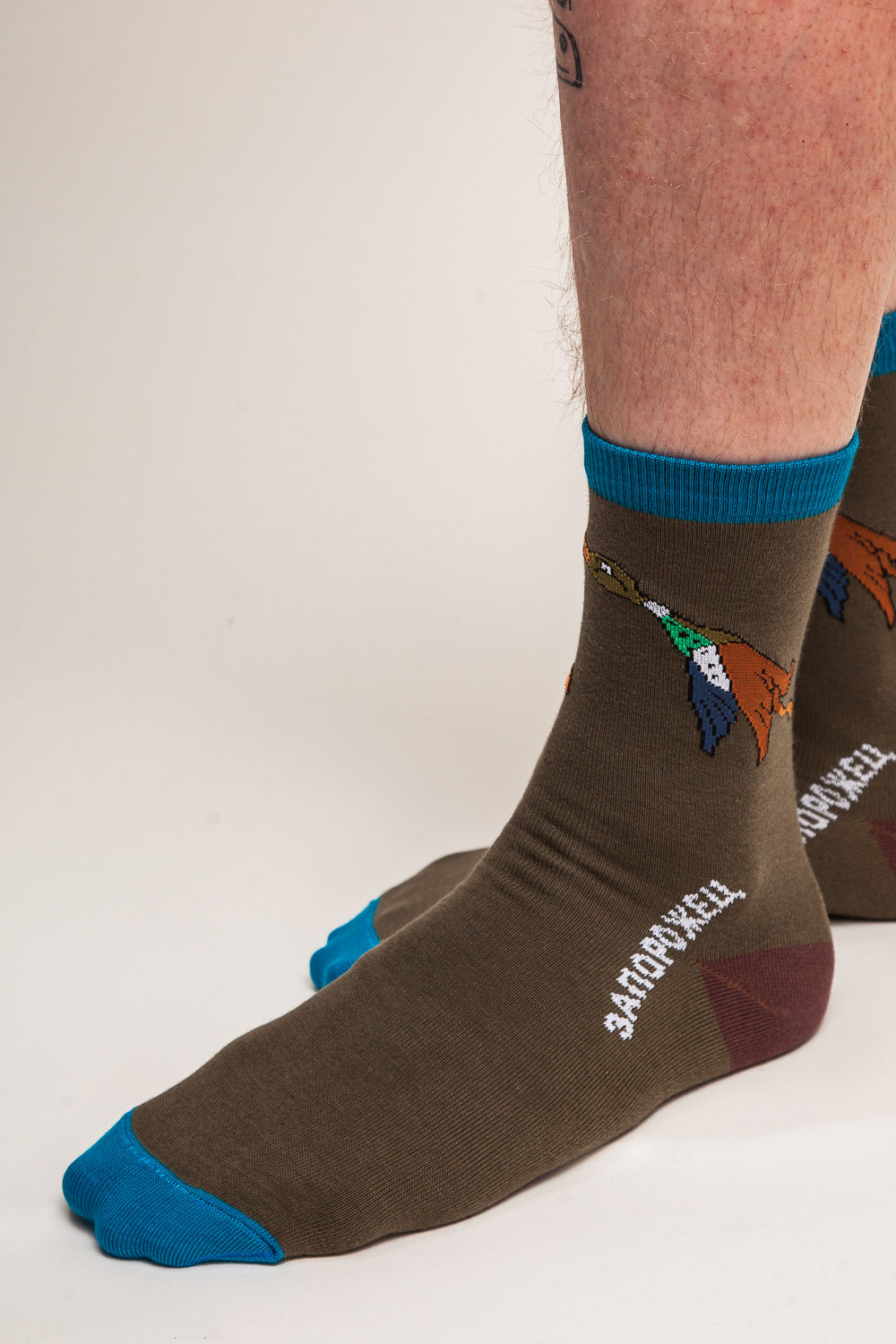 Носки от российской марки Запорожец, выполненные из хлопковой ткани с добавлением эластана. Традиционная форма, средняя длина, укрепленный носок и пятка. Носки представлены в комбинированной расцветке, украшенной изображением утки.