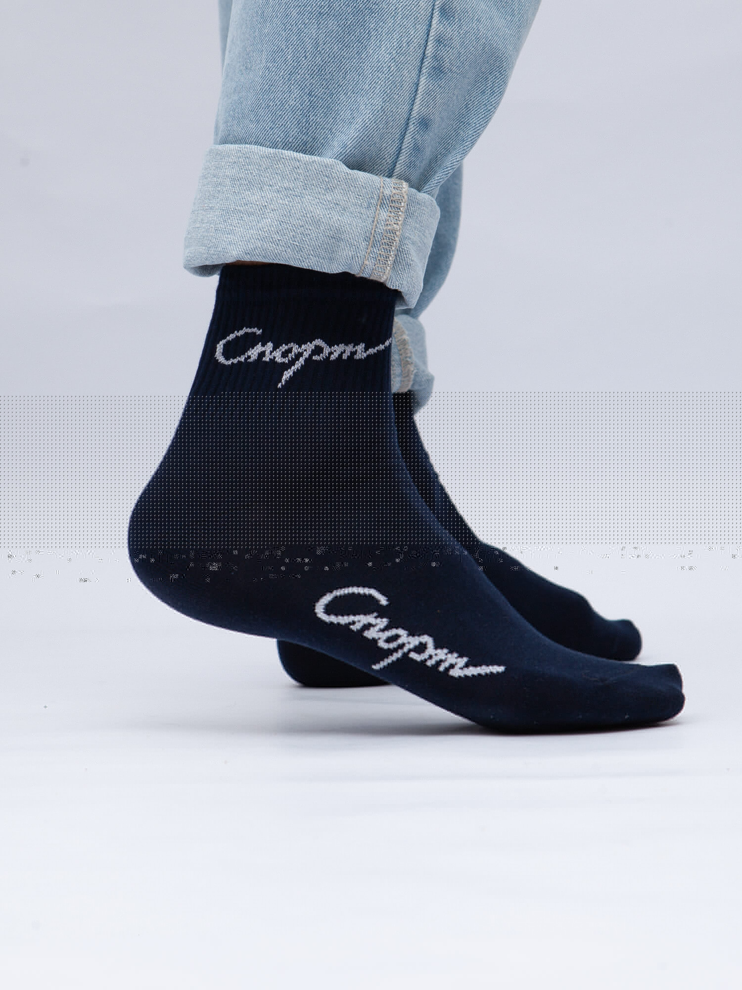 Короткие носки от российской марки Запорожец, выполненные из натуральной хлопковой ткани. Традиционная форма, эластичная резинка у основания, укрепленный мысок и пятка. Носки представлены в однотонной расцветке, украшенной вышивкой «Спорт» в нижней части.