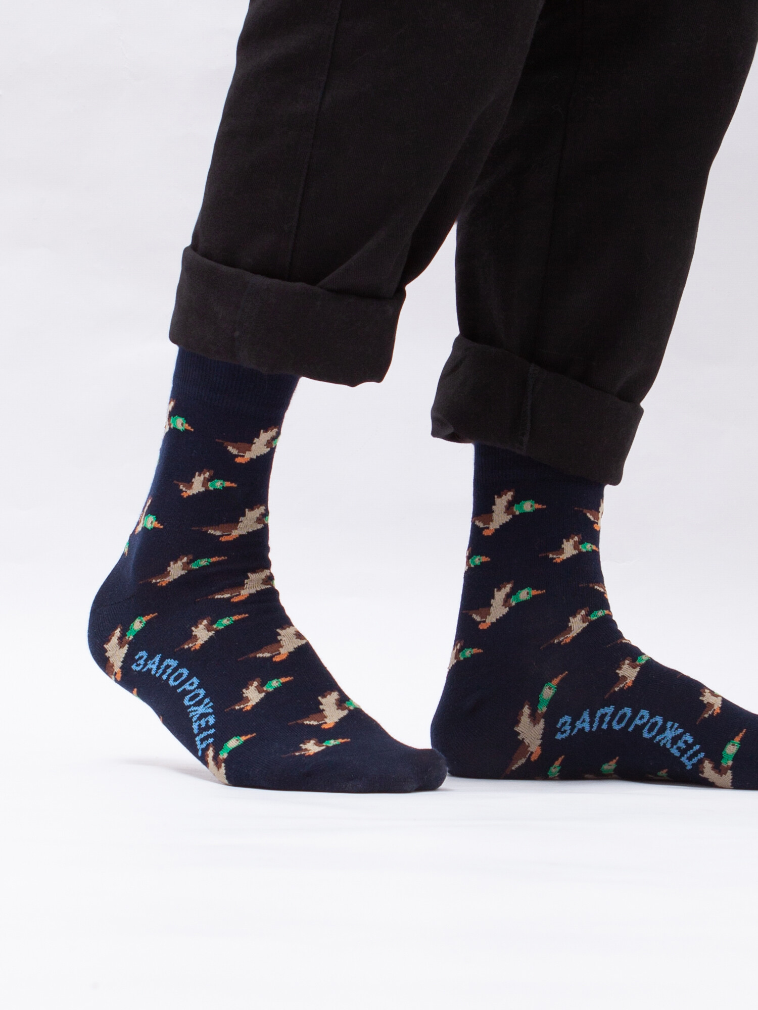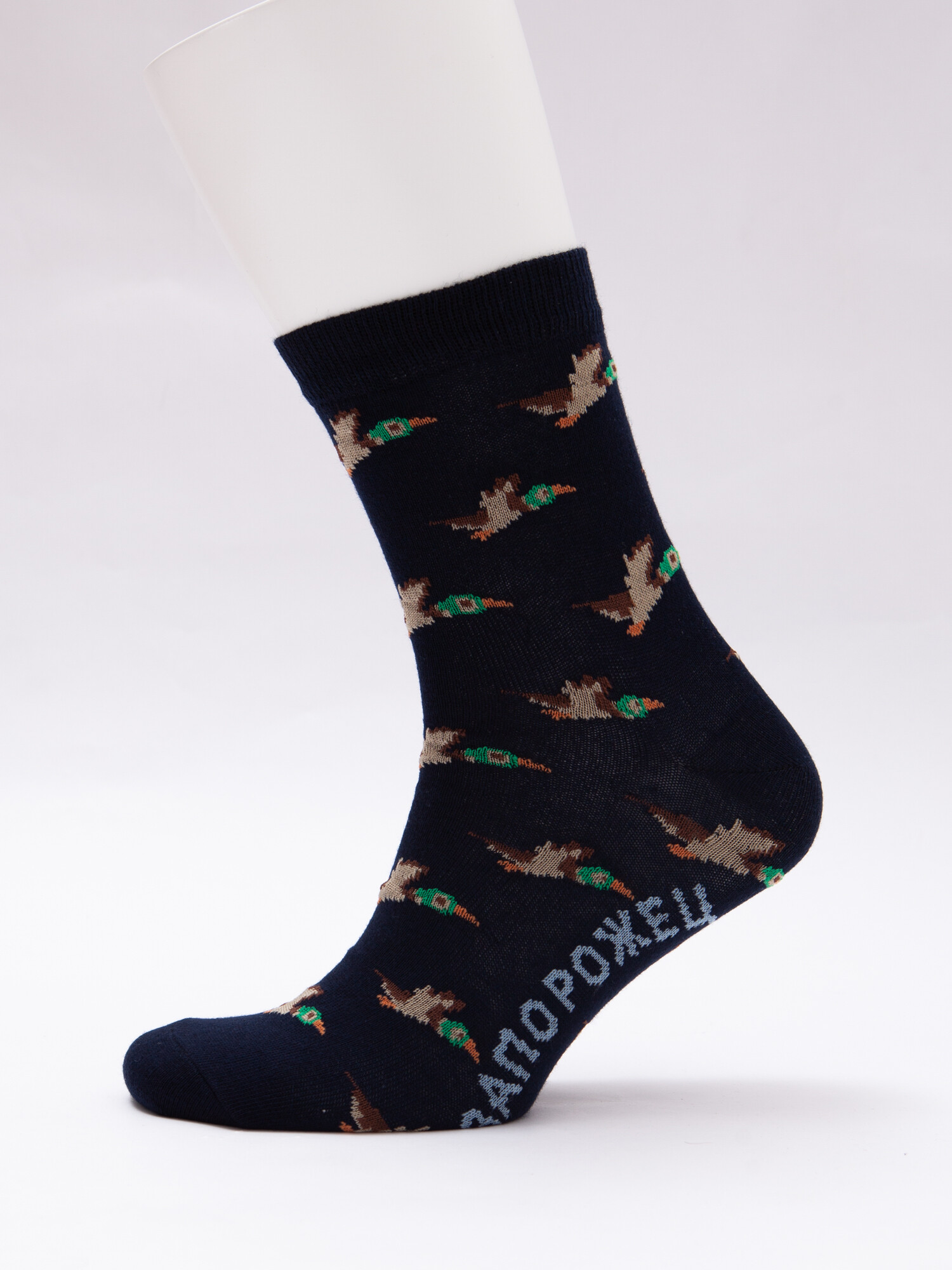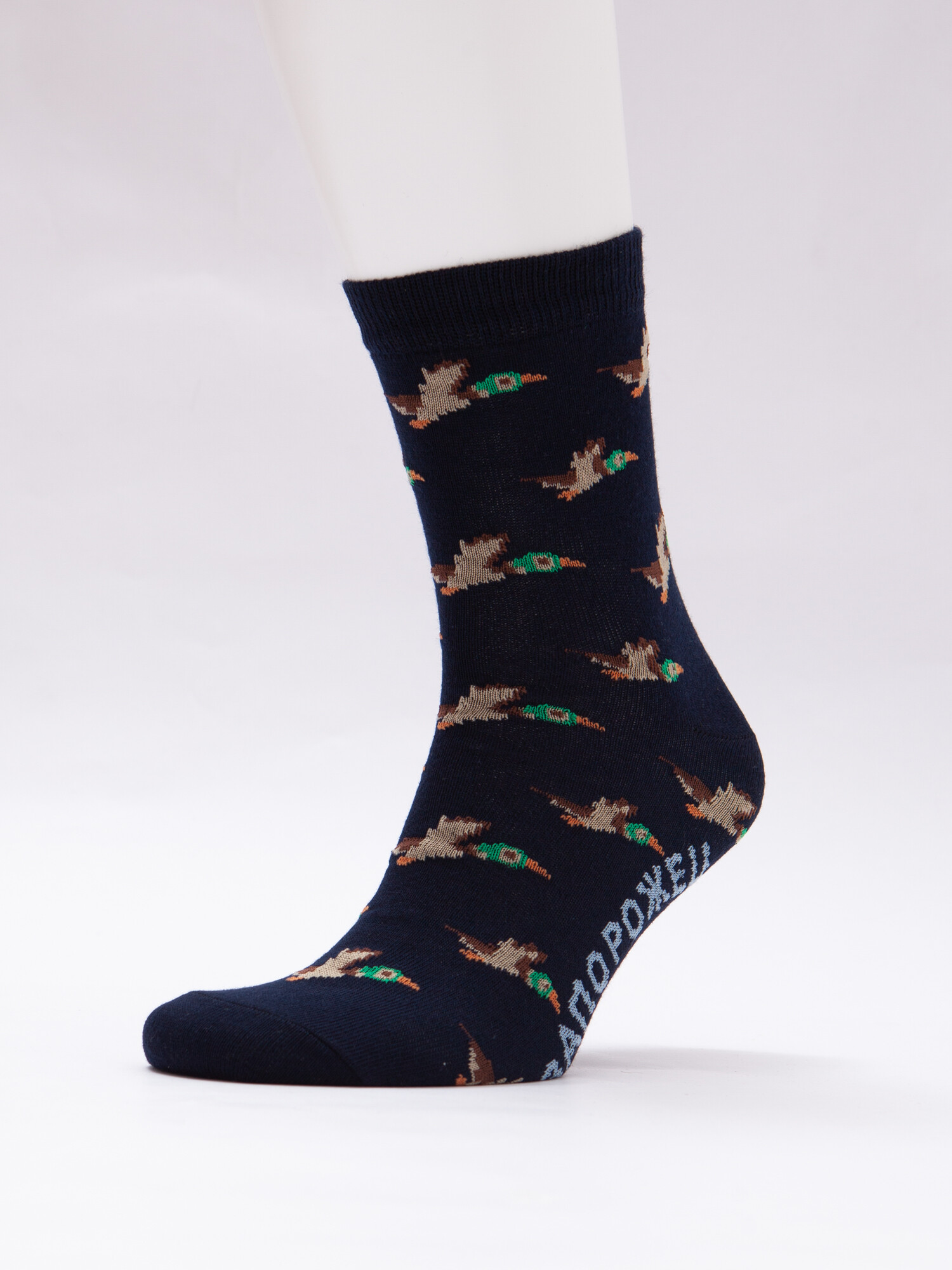 Носки от бренда Запорожец, выполненные из натуральной хлопковой ткани. Традиционная форма, средняя длина, укрепленный носок с пяткой и эластичная резинка в верхней части, обеспечивающая оптимальную фиксацию. Носки представлены в оригинальной расцветке, украшенной изображениями уток на всей поверхности.