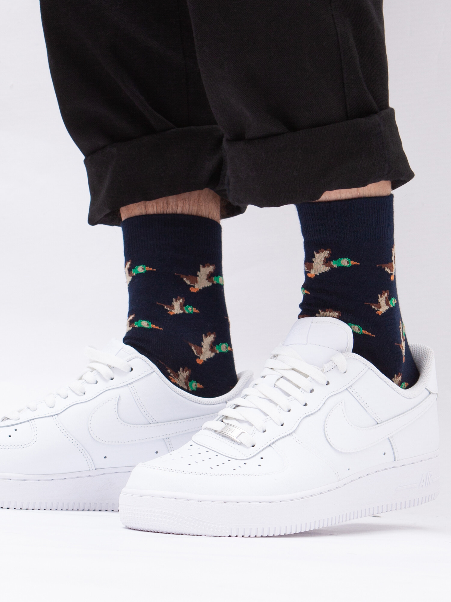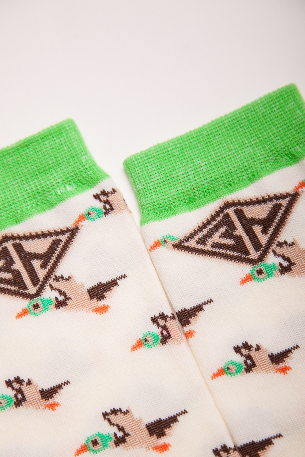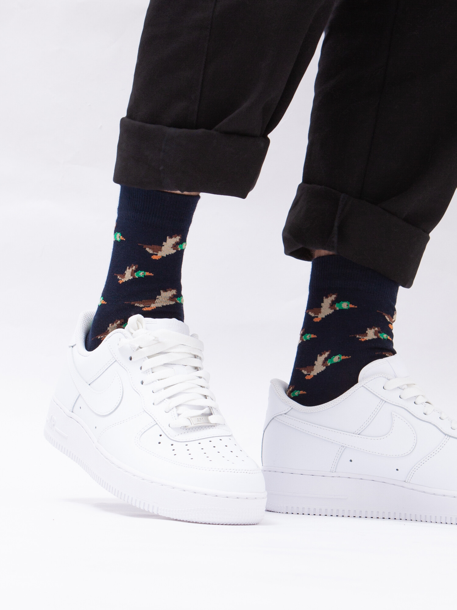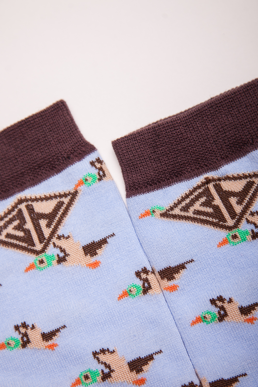 Носки от бренда Запорожец, выполненные из натуральной хлопковой ткани. Традиционная форма, средняя длина, укрепленный носок с пяткой и эластичная резинка в верхней части, обеспечивающая оптимальную фиксацию. Носки представлены в оригинальной расцветке, украшенной изображениями уток на всей поверхности.