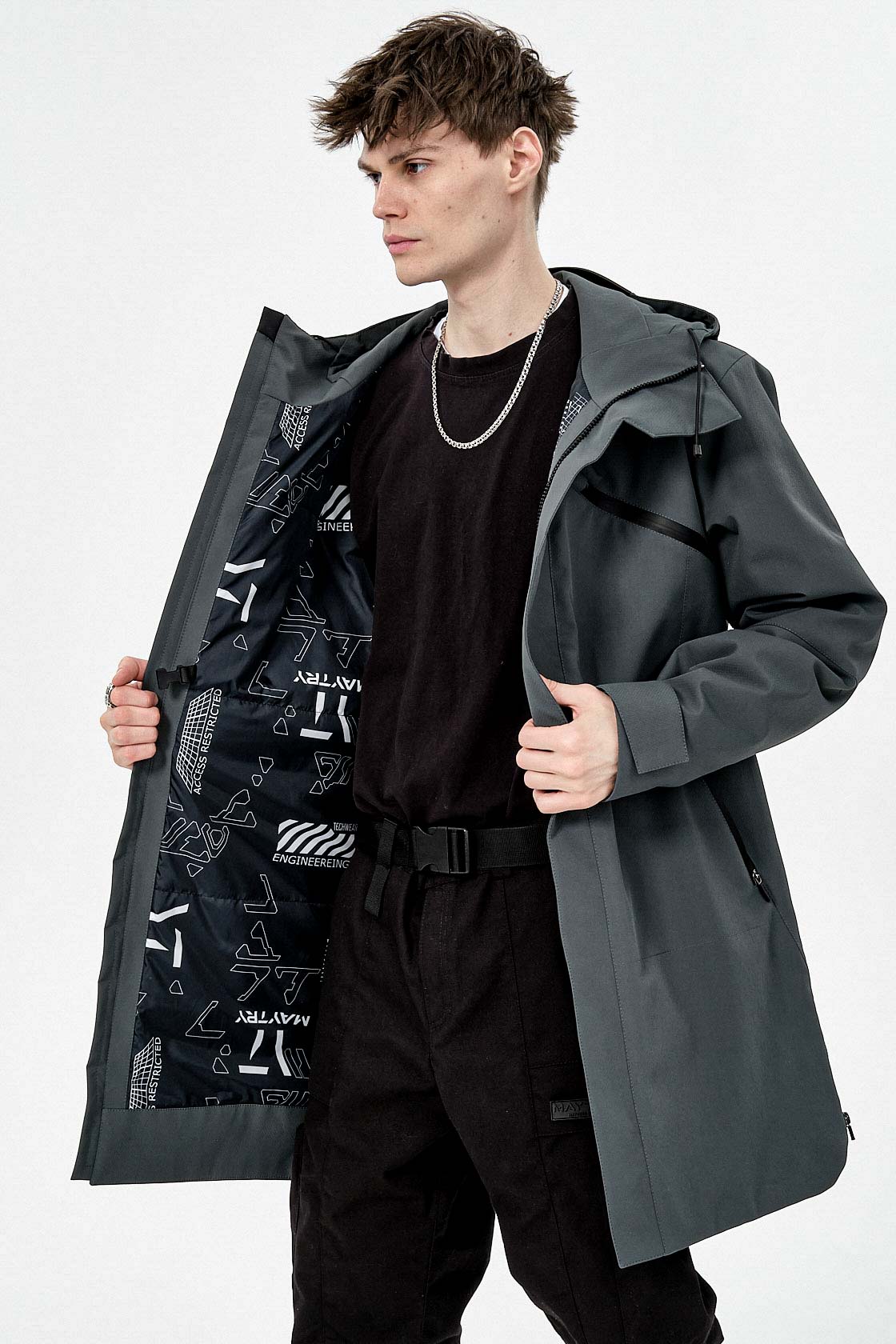 Утеплённый плащ с фигурной магнитной планкой: