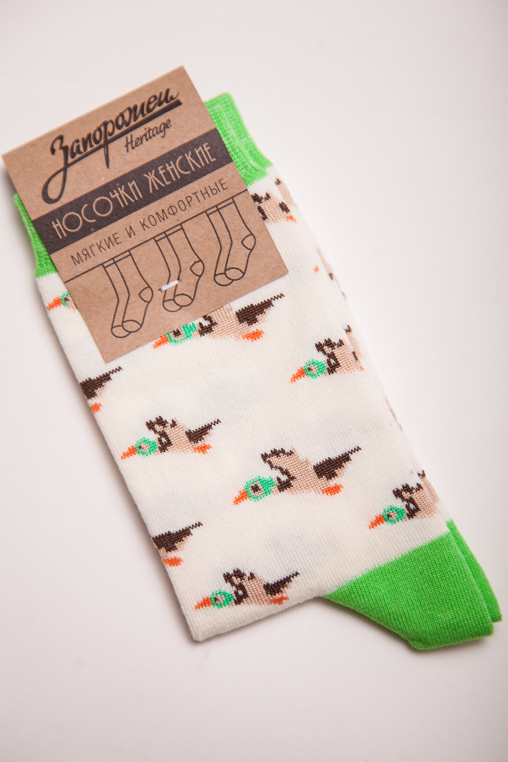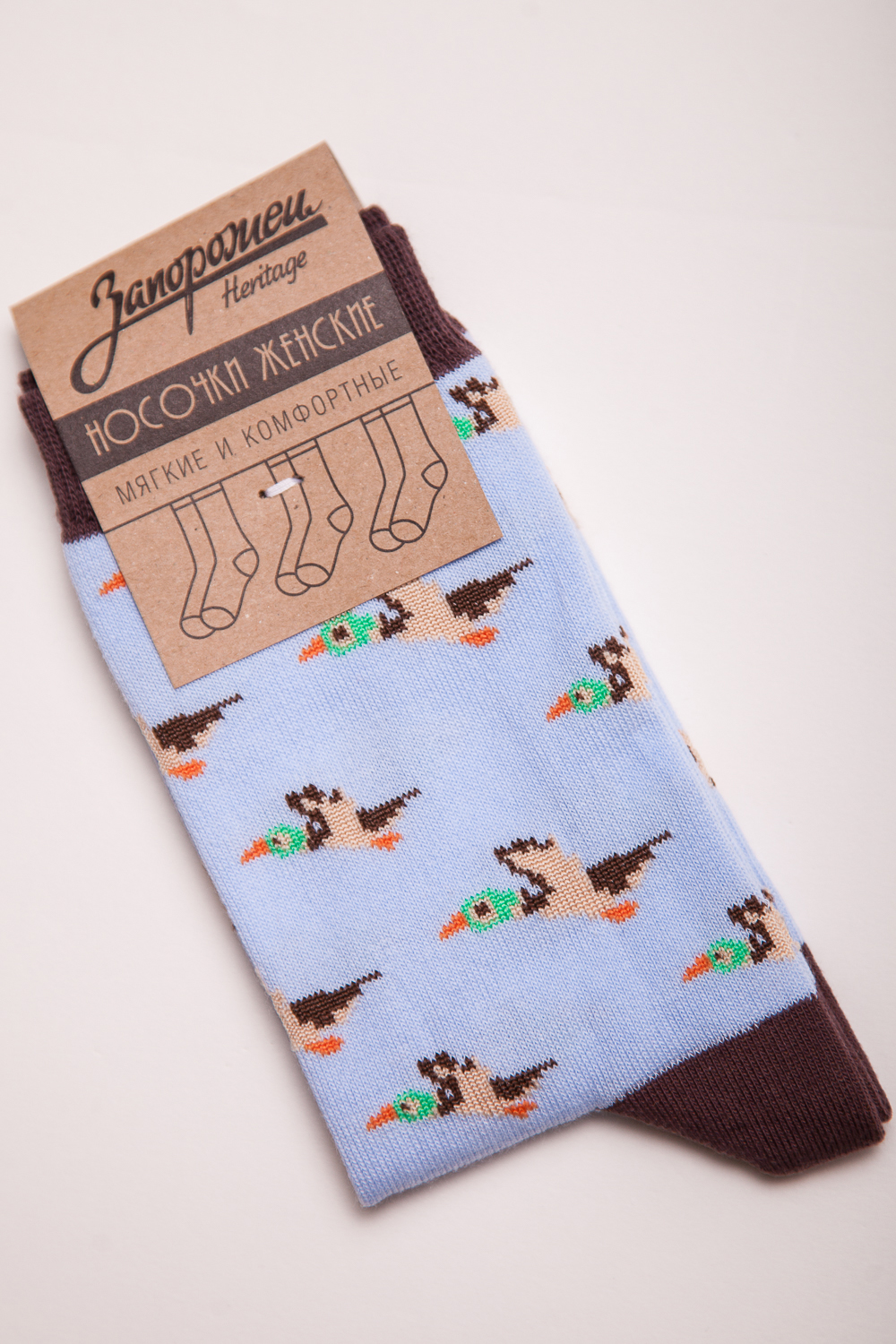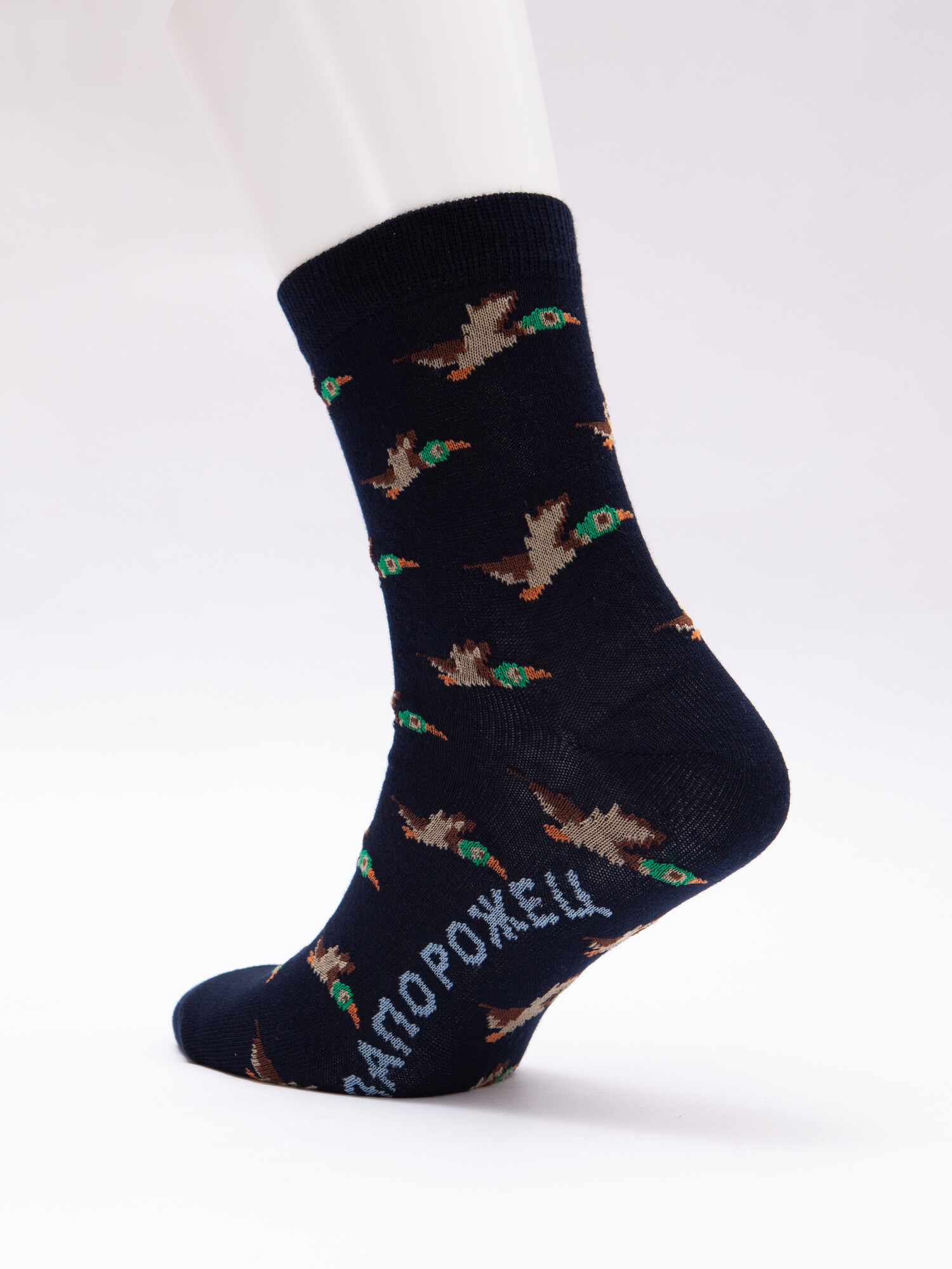 Носки от бренда Запорожец, выполненные из натуральной хлопковой ткани. Традиционная форма, средняя длина, укрепленный носок с пяткой и эластичная резинка в верхней части, обеспечивающая оптимальную фиксацию. Носки представлены в оригинальной расцветке, украшенной изображениями уток на всей поверхности.