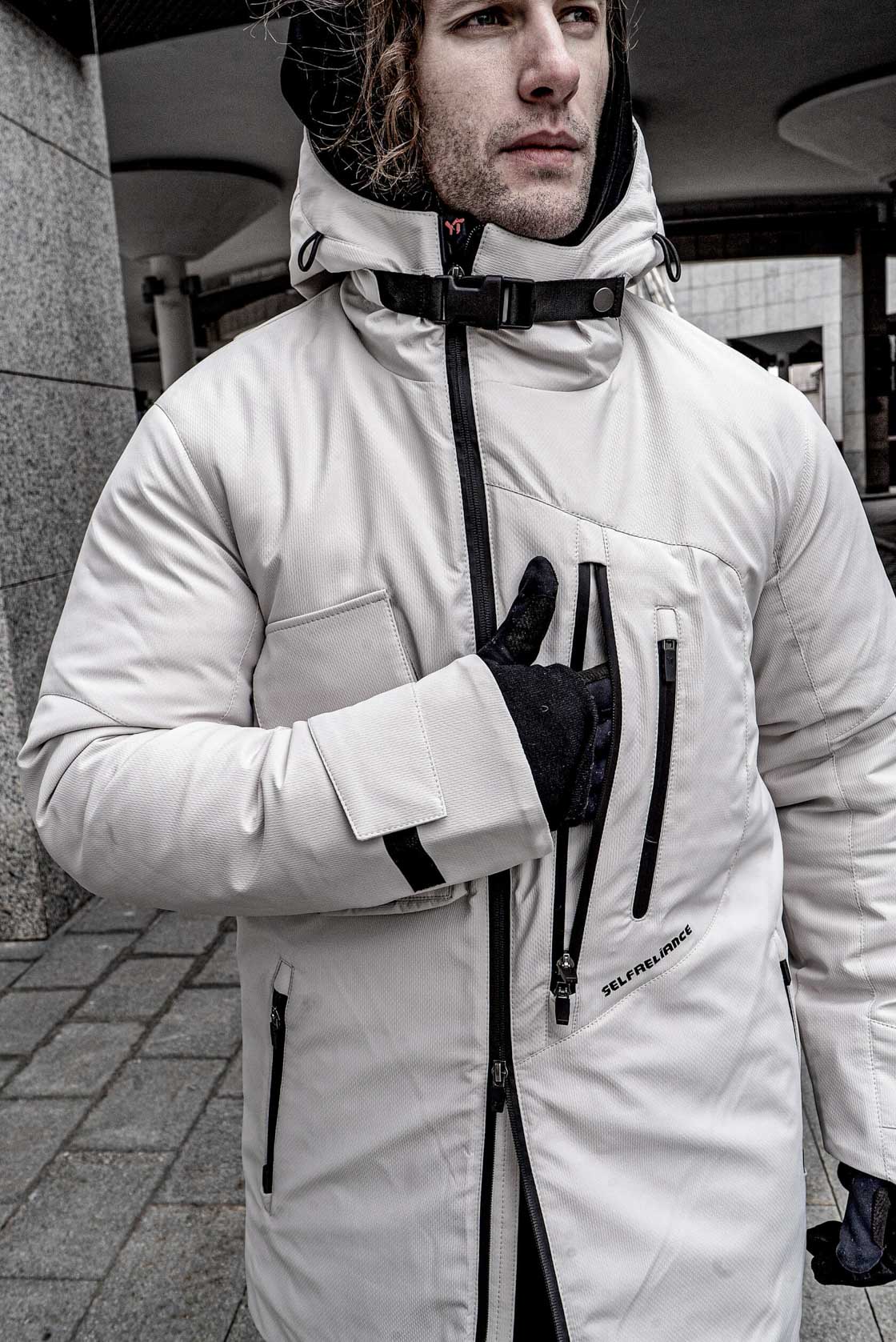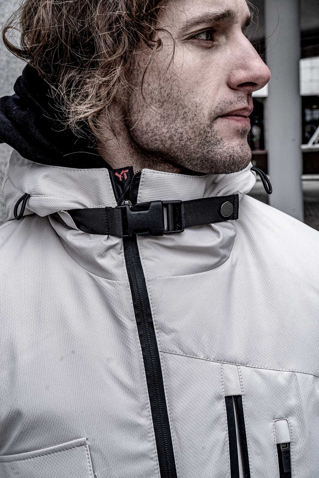 Втачной капюшон имеет регулировку по лицевому срезу эластичным шнуром со стопорами, спрятанными внутрь конструкции капюшона.