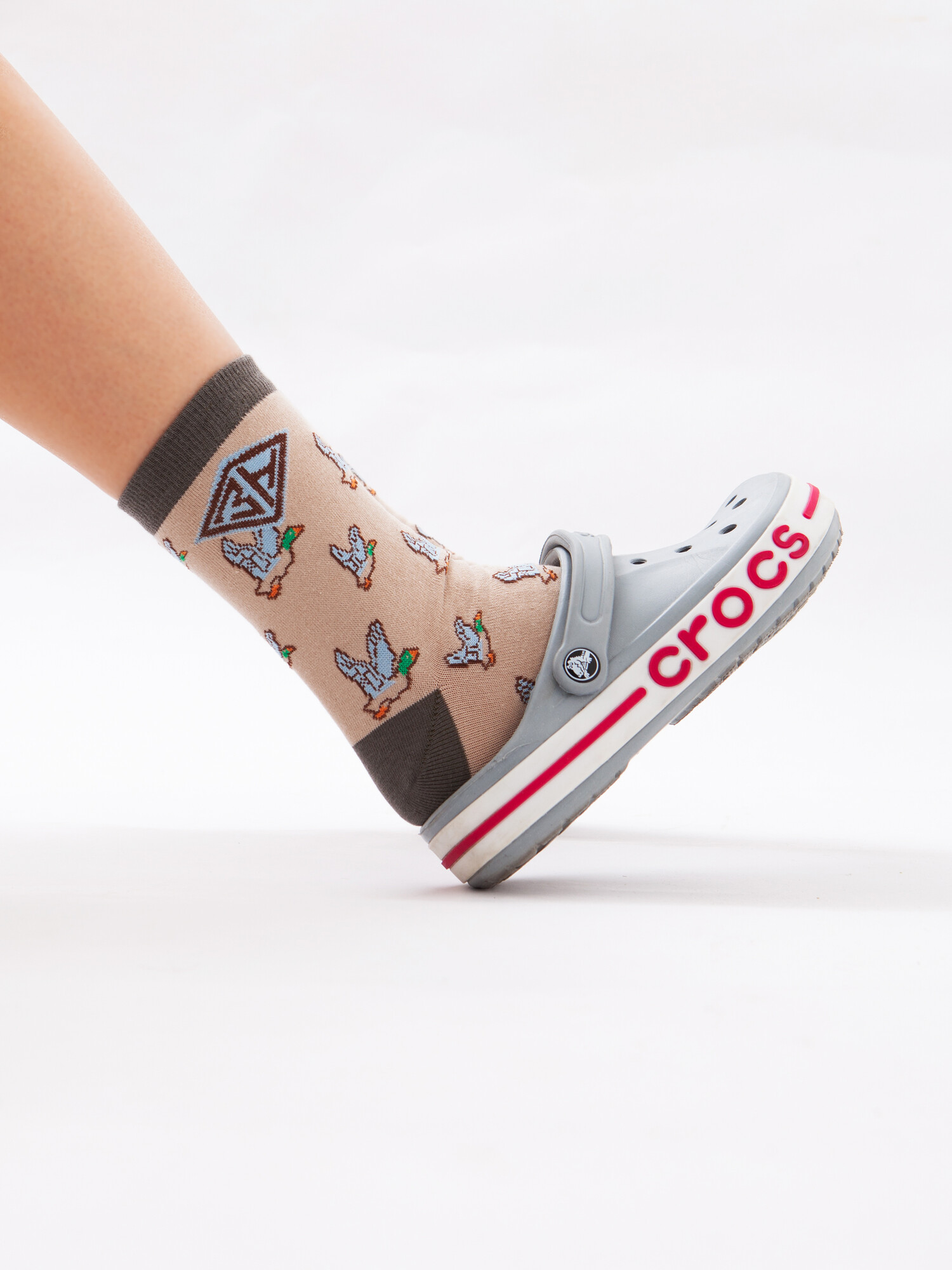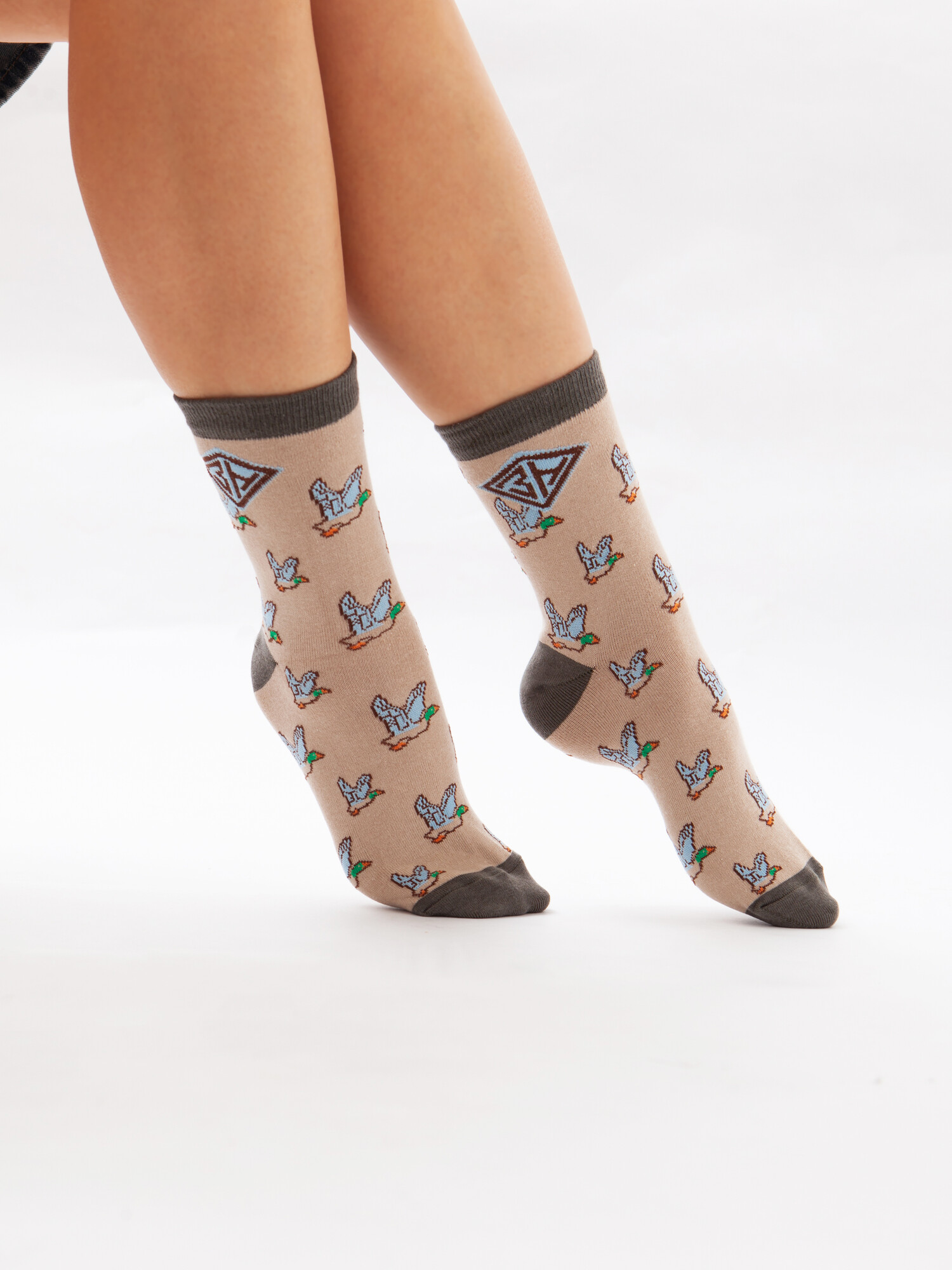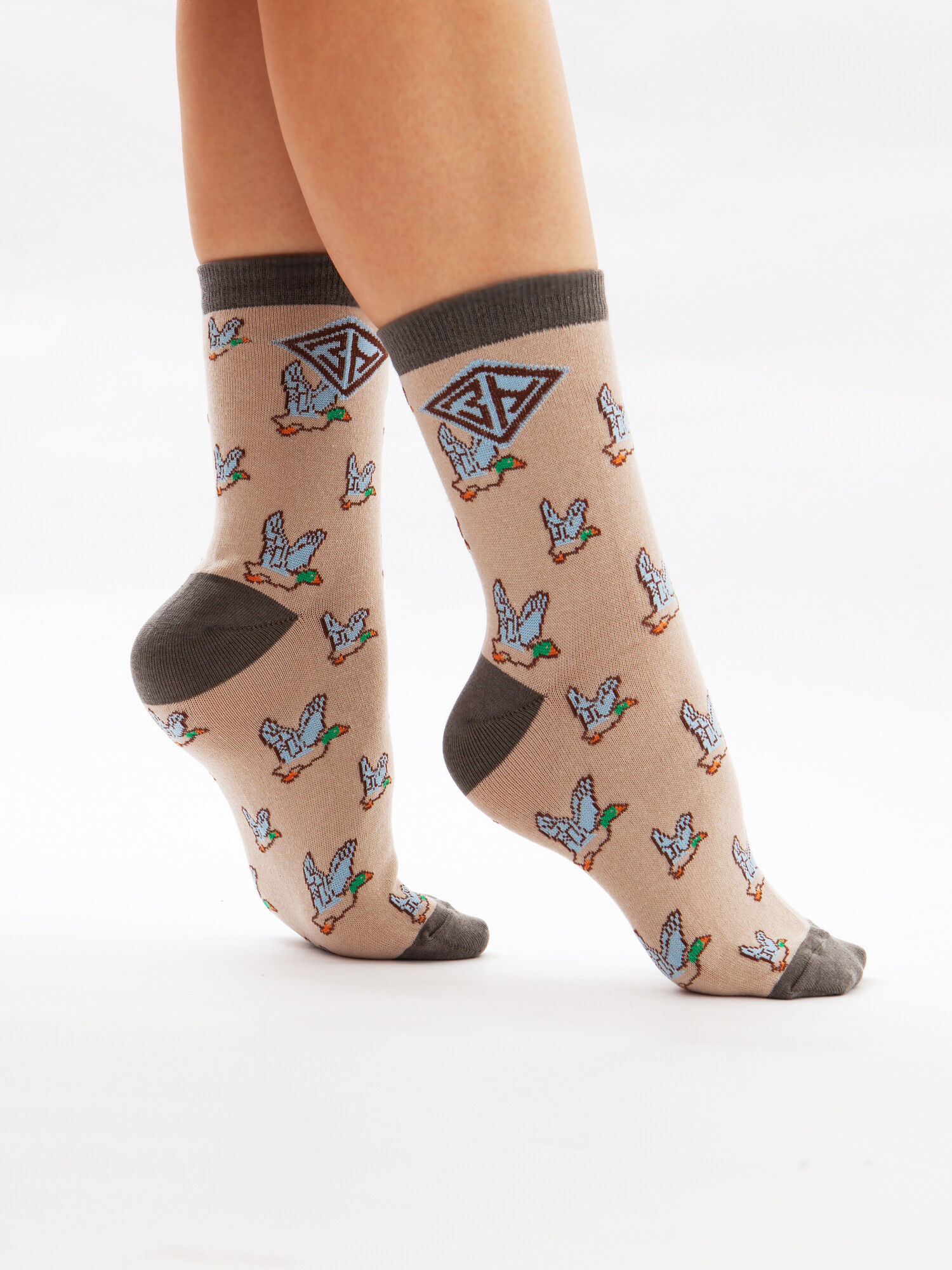 Носки от российского бренда Запорожец, выполненные из ткани на основе хлопка. Традиционная форма, средняя длина, укрепленный носок с пяткой и эластичная резинка в верхней части, обеспечивающая оптимальную фиксацию. Носки представлены в оригинальной расцветке, украшенной изображениями уток на всей поверхности.