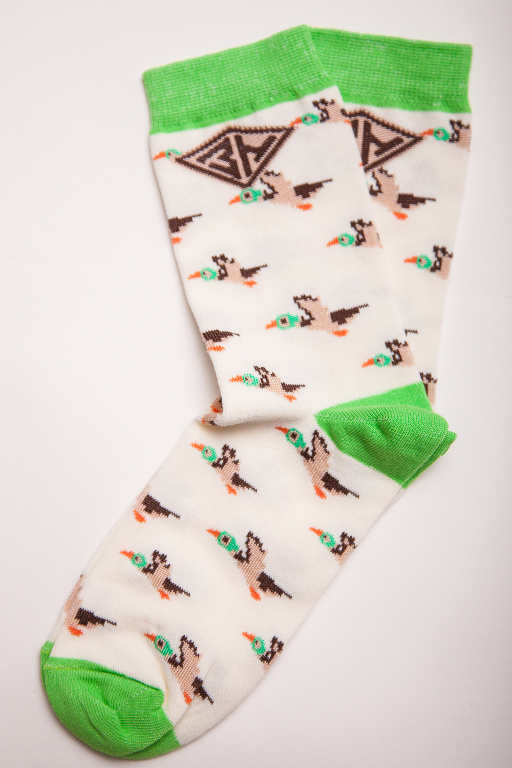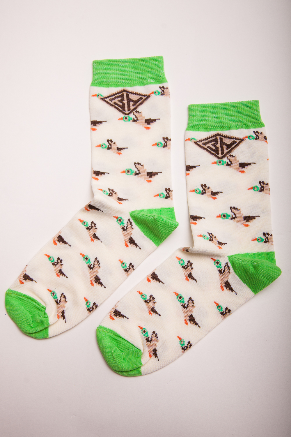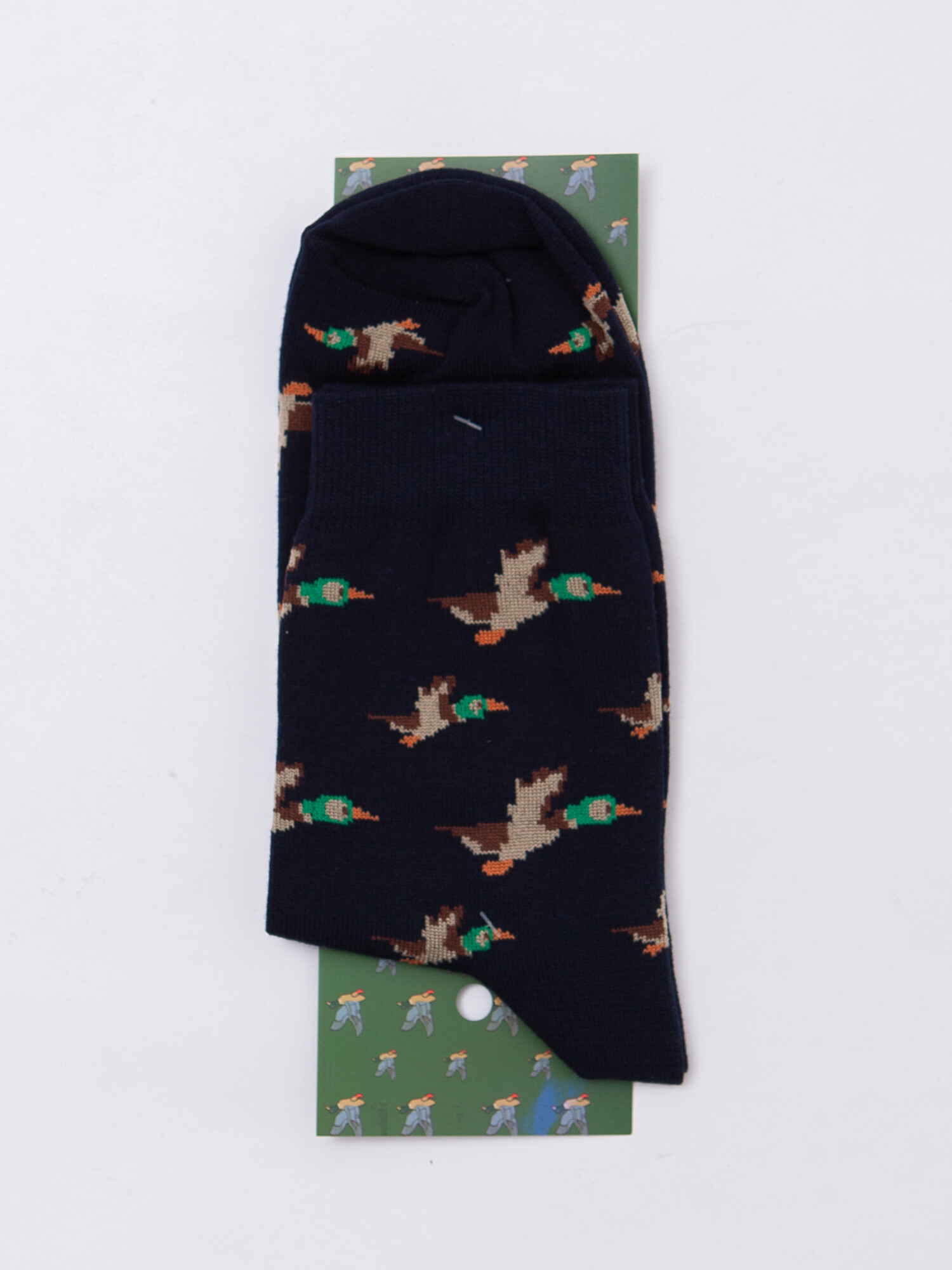 Носки от бренда Запорожец, выполненные из натуральной хлопковой ткани. Традиционная форма, средняя длина, укрепленный носок с пяткой и эластичная резинка в верхней части, обеспечивающая оптимальную фиксацию. Носки представлены в оригинальной расцветке, украшенной изображениями уток на всей поверхности.