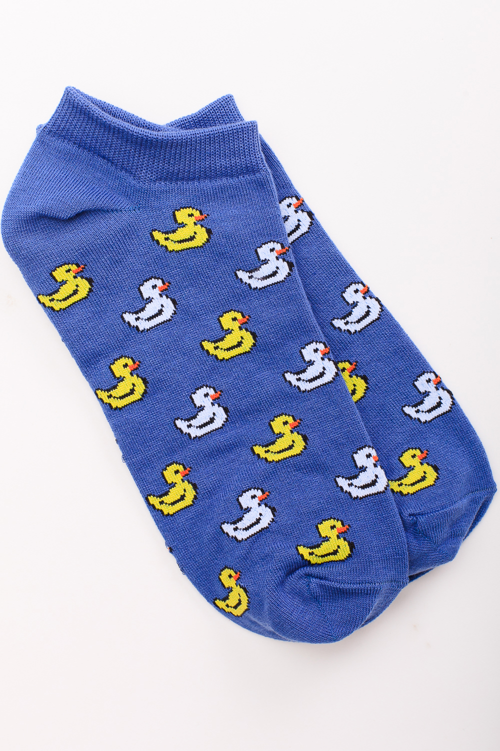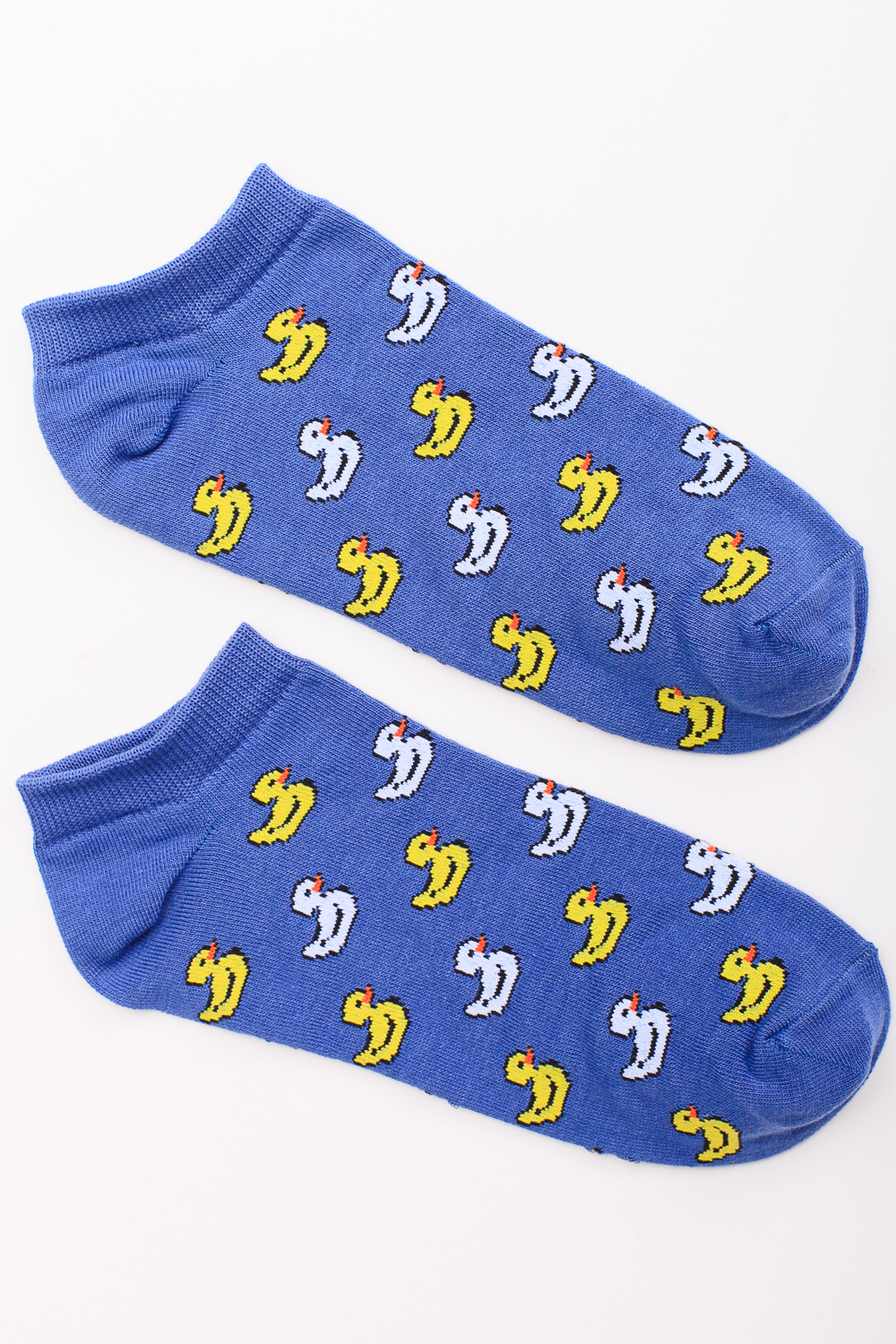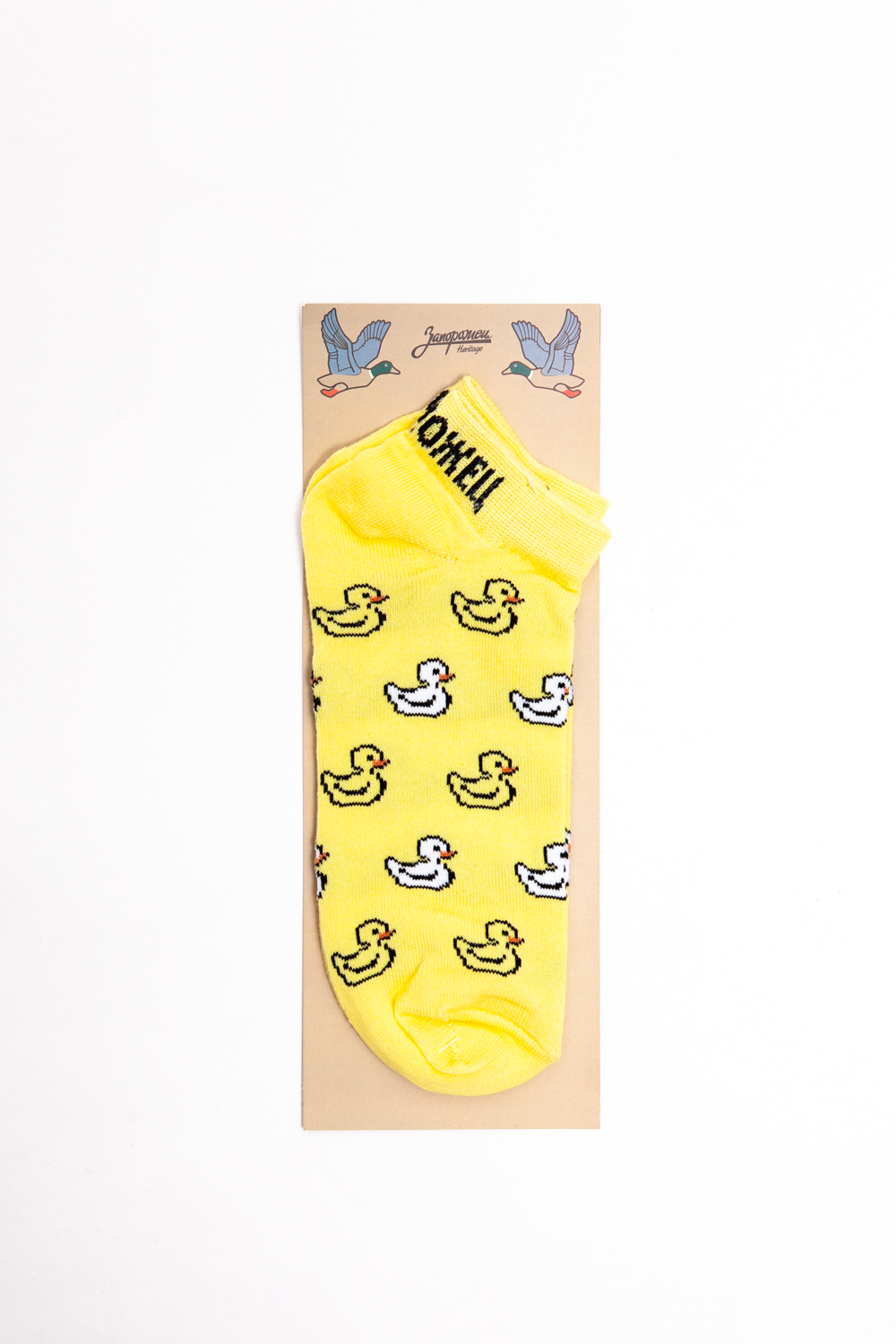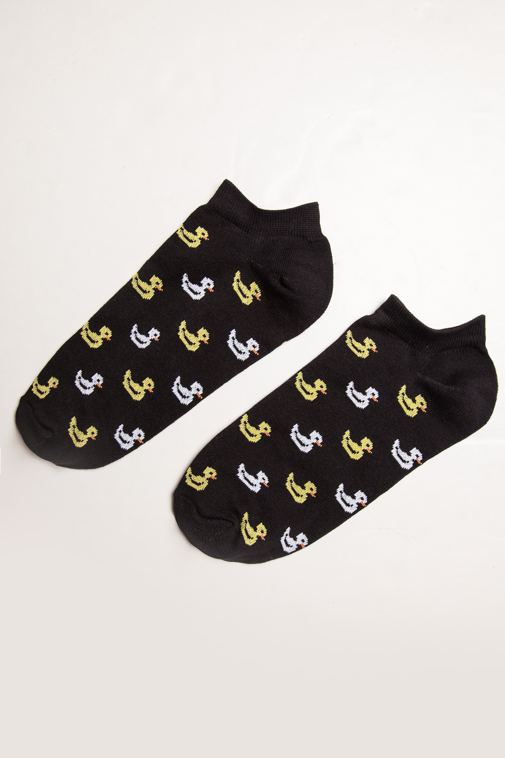 Носки от бренда Запорожец, выполненные из натуральной хлопковой ткани. Традиционная форма, короткая длина, укрепленный носок с пяткой и эластичная резинка в верхней части, обеспечивающая оптимальную фиксацию. Носки представлены в оригинальной расцветке, украшенной изображениями утят на всей поверхности.