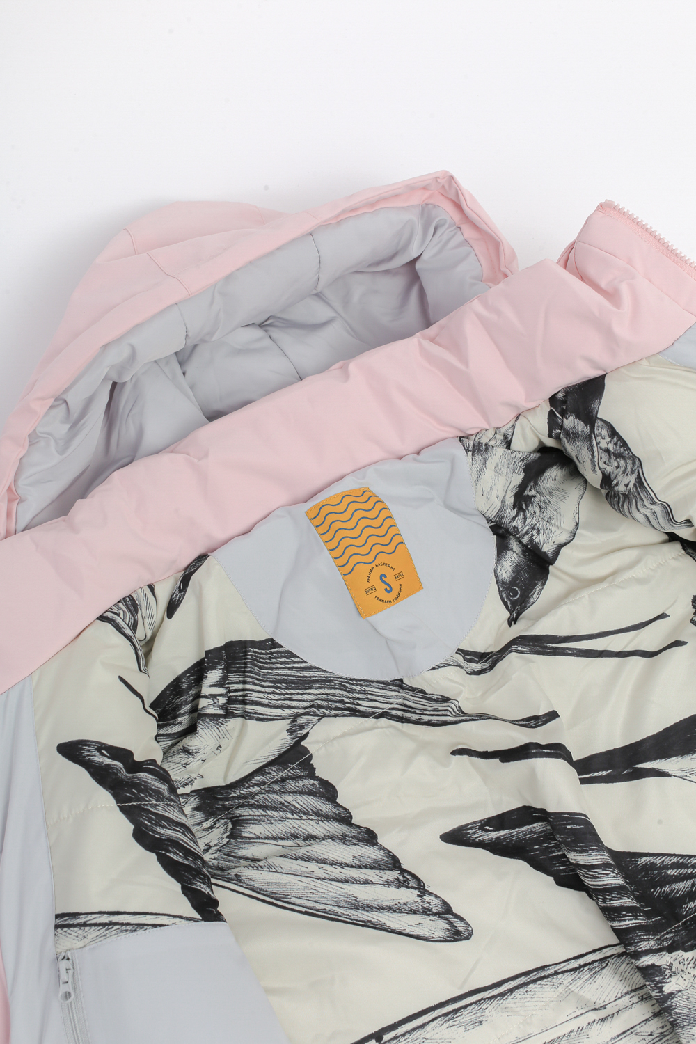 Задняя панель урашена принтом с ласточками.